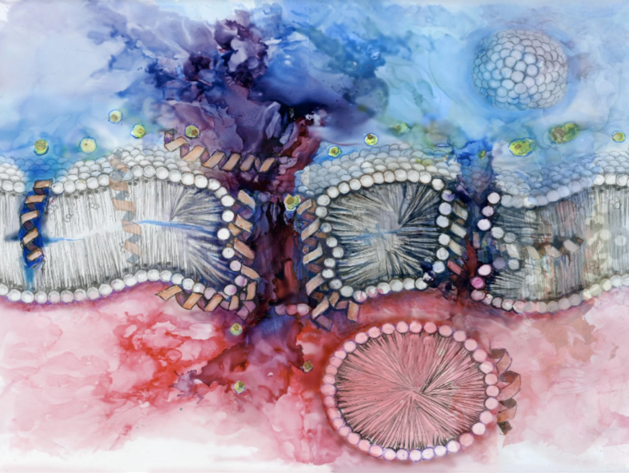 Consisting mostly of alcohol inks on opaque and translucent synthetic papers, these images portray the disruption and eventual explosion of the bacterial membrane when exposed to various peptides and drugs. Differences in the translucency of the papers work to create a sense of layering and dimension which is evocative of the cellular environment. Color schemes are explored to reflect the accuracy of molecular phenomena but also to exaggerate it artistically and heighten its significance to the viewer. Dry and wet mediums are combined in an attempt to create various effects and textures that enable viewers to imagine phenomena taking place within cells that remain otherwise unseen.